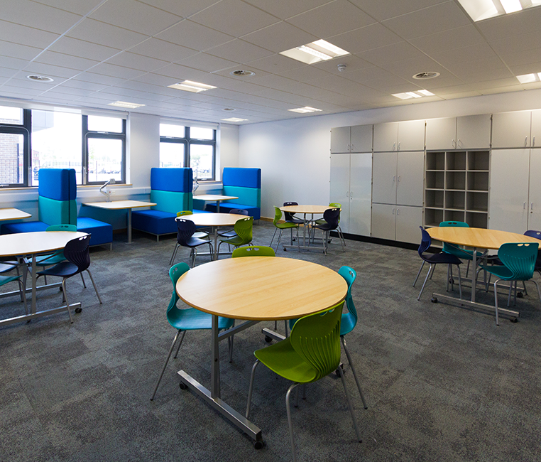 The internal fit-out of the College comprises metal stud plasterboard-faced partitions, a mixture of plasterboard and laying grid ceilings, and carpet and vinyl floor finishes.
